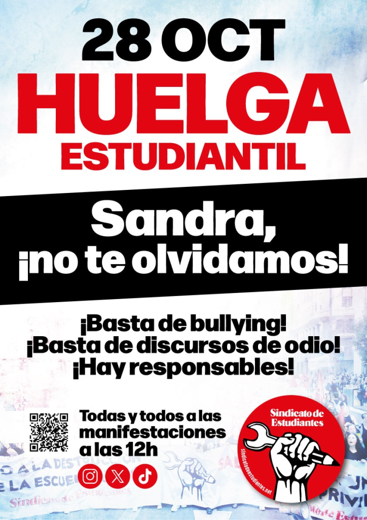 Hoy, 28 de octubre, miles de estudiantes estaban llamados a la huelga. El motivo era, o debía ser, un grito unánime, sordo y roto contra el acoso escolar. El motivo tenía un nombre: Sandra, una niña de 14 años cuya vida se apagó hace dos semanas, presuntamente devorada por esa lacra silenciosa que es el bullying.