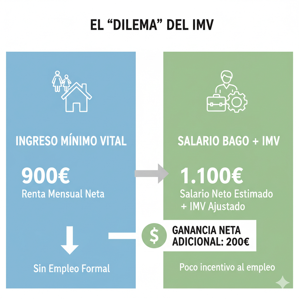 El informe argumenta que la escasa diferencia entre la prestación y un salario bajo en la economía formal hace poco atractiva la incorporación al mercado laboral. Cita como ejemplo que “una familia que recibe 900 euros y consigue un trabajo por 1.100 netos apenas mejora su renta en 200 euros”.
