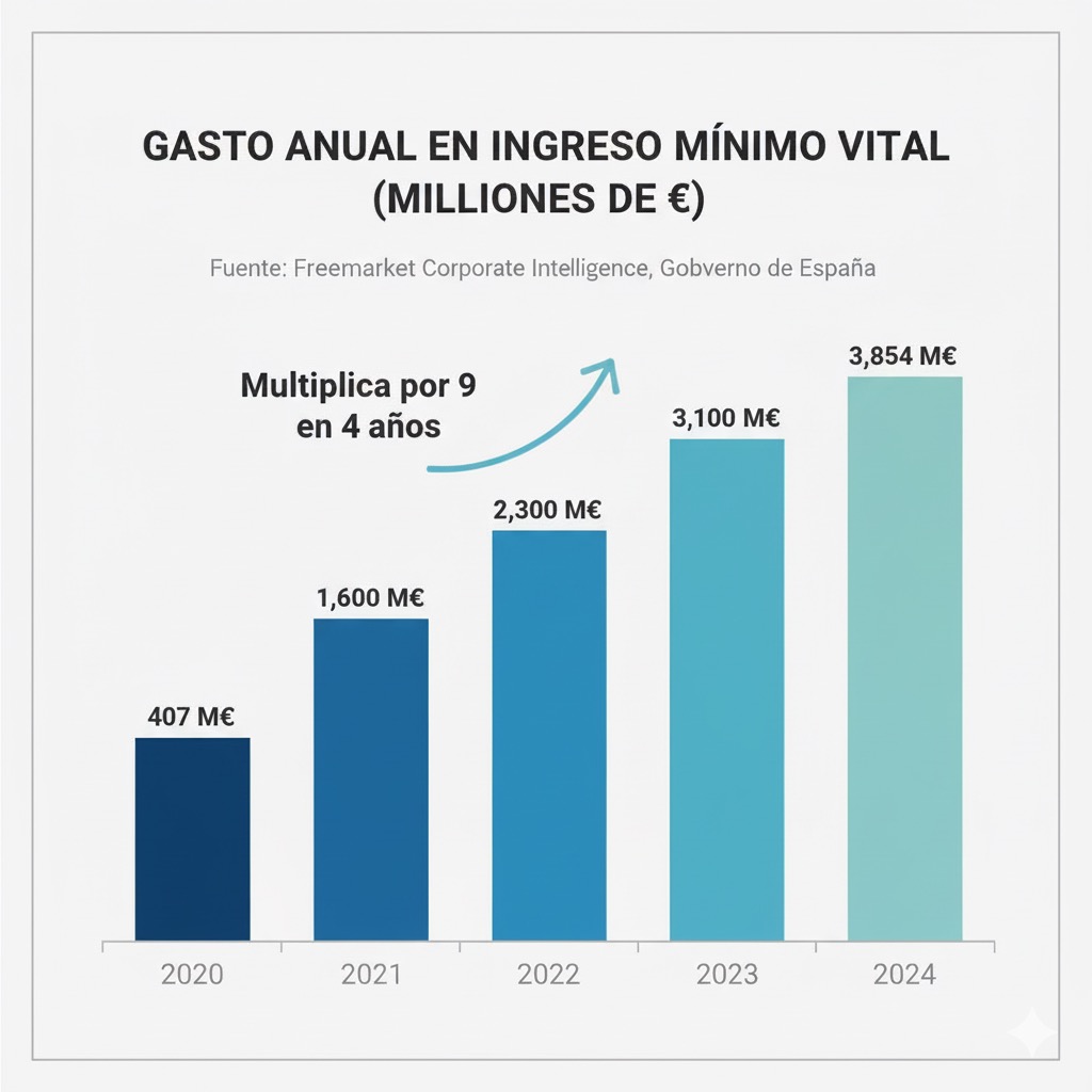 El gasto público destinado al Ingreso Mínimo Vital (IMV) en España ha experimentado un crecimiento exponencial desde su implantación. Según datos recogidos en un informe de la consultora Freemarket Corporate Intelligence, el Gobierno cerró el ejercicio 2024 con una partida de 3.854 millones de euros destinada a esta prestación, una cifra que multiplica por nueve los 407 millones registrados en 2020.
